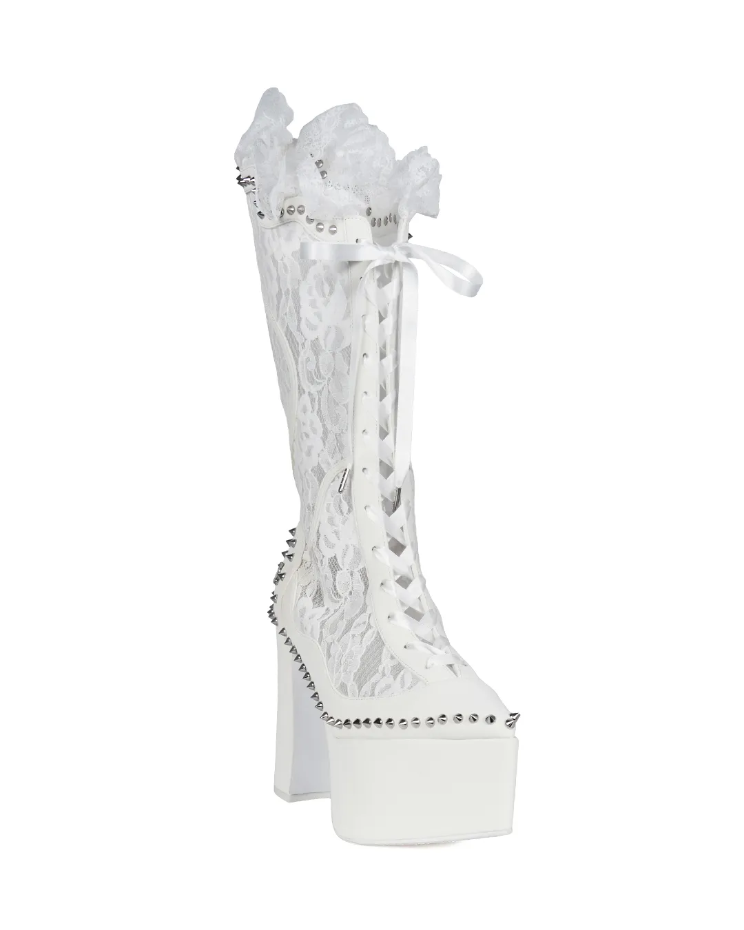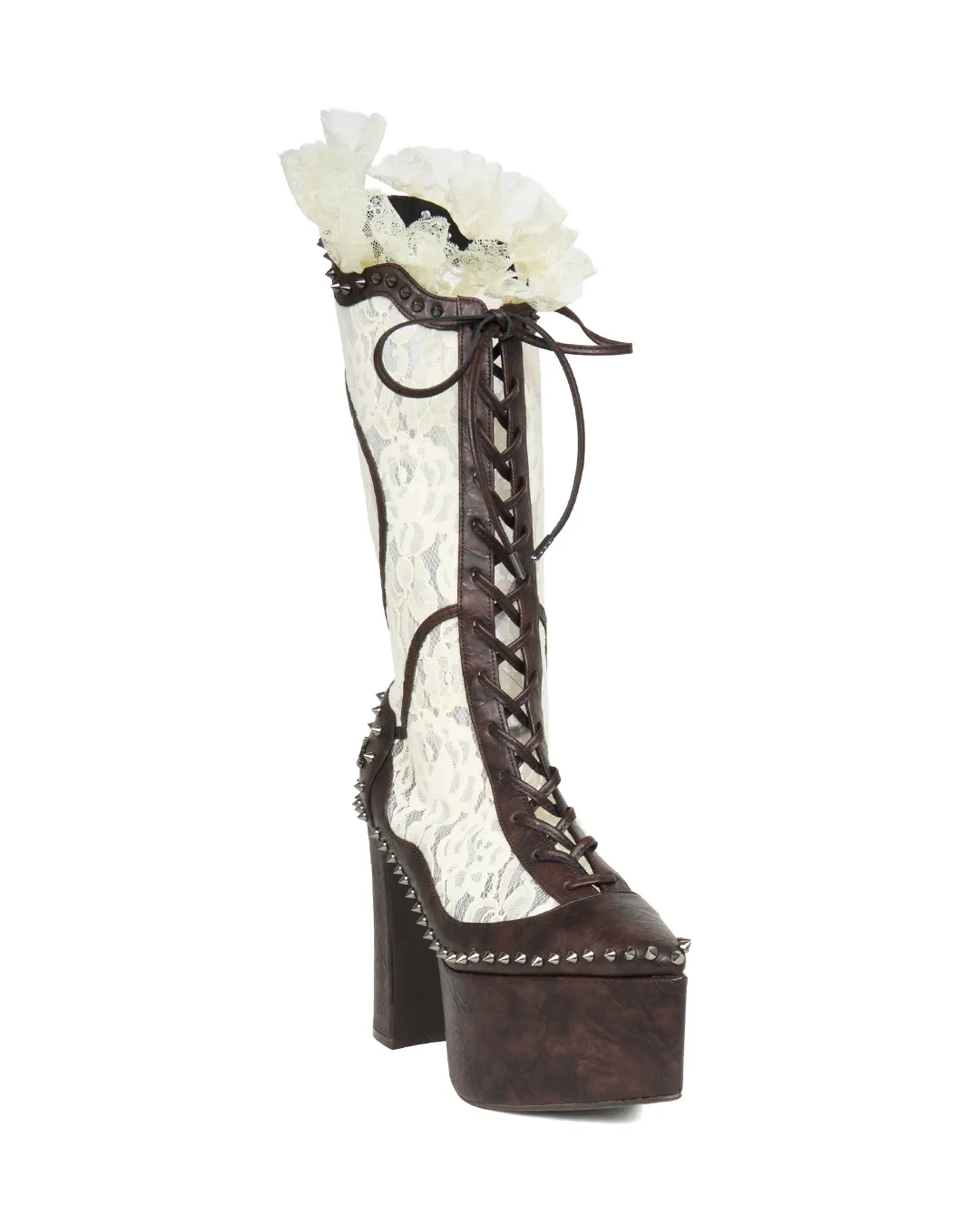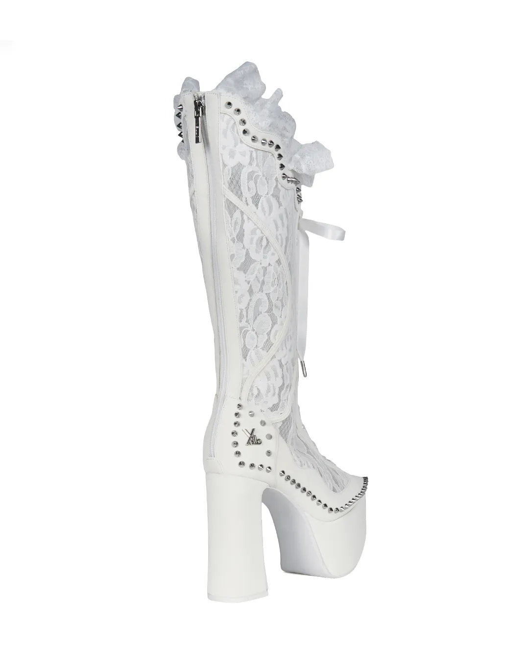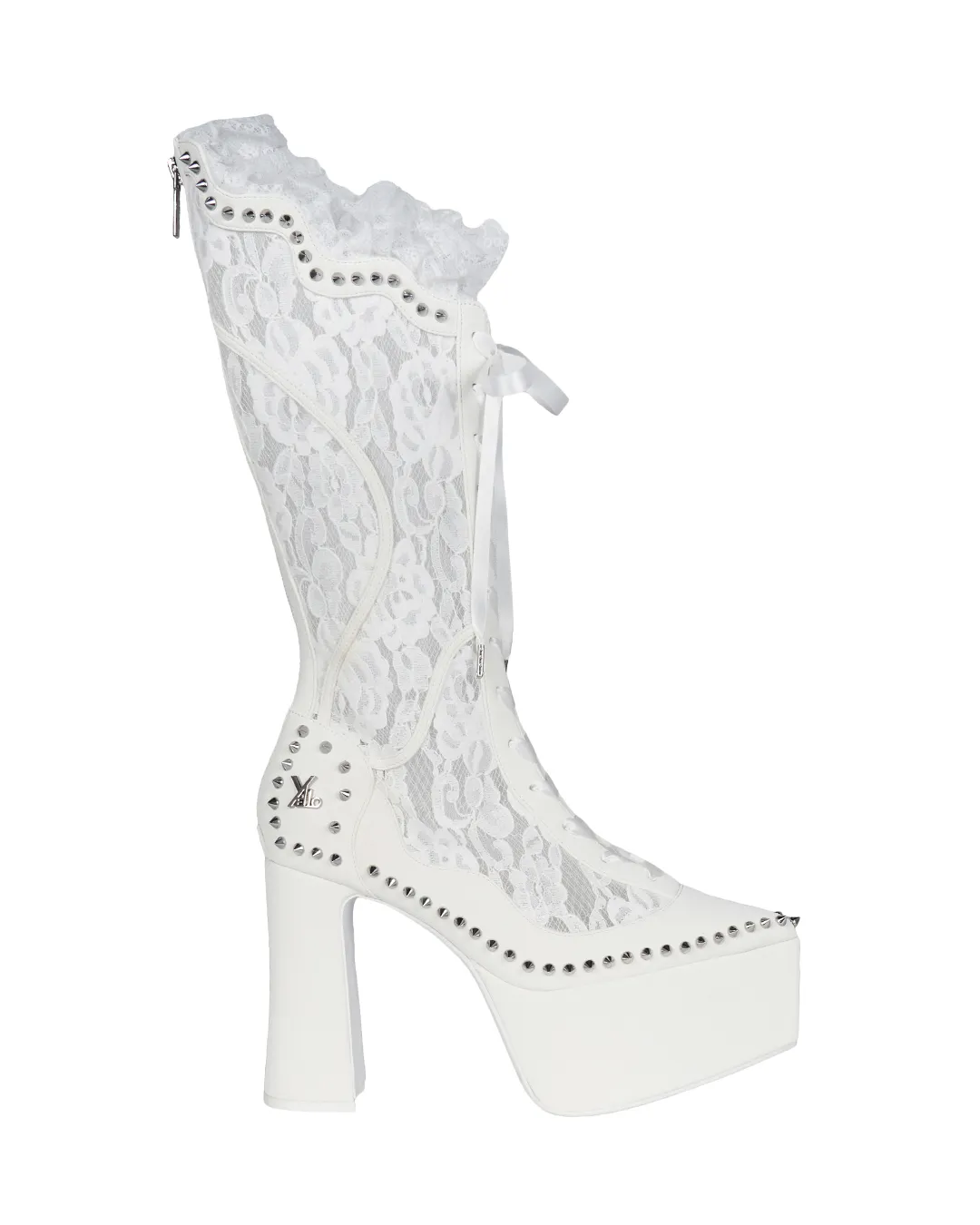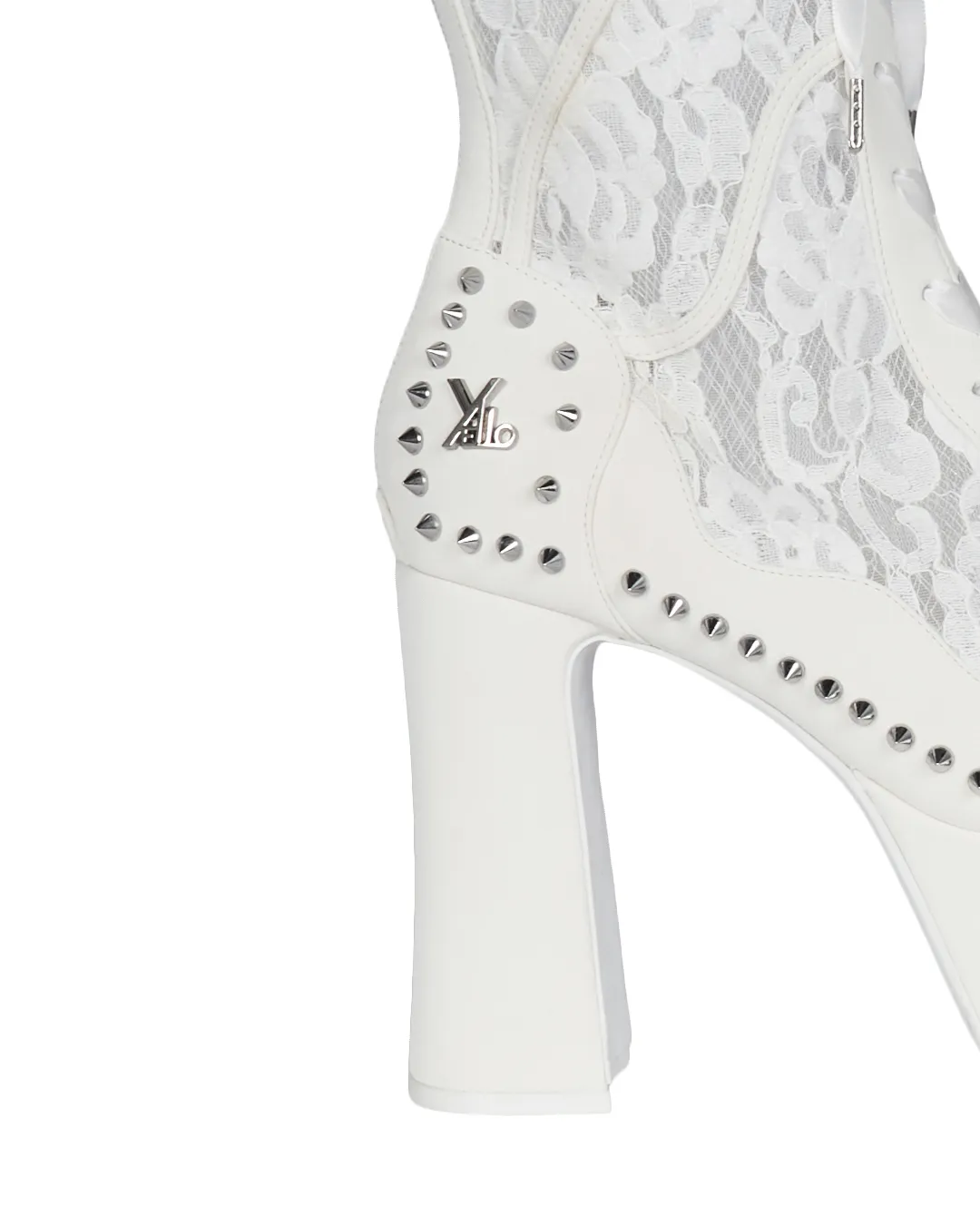 The sheer, delicate lace shaft is finished with curved piping that beautifully contours the calves, enhancing the natural leg line.