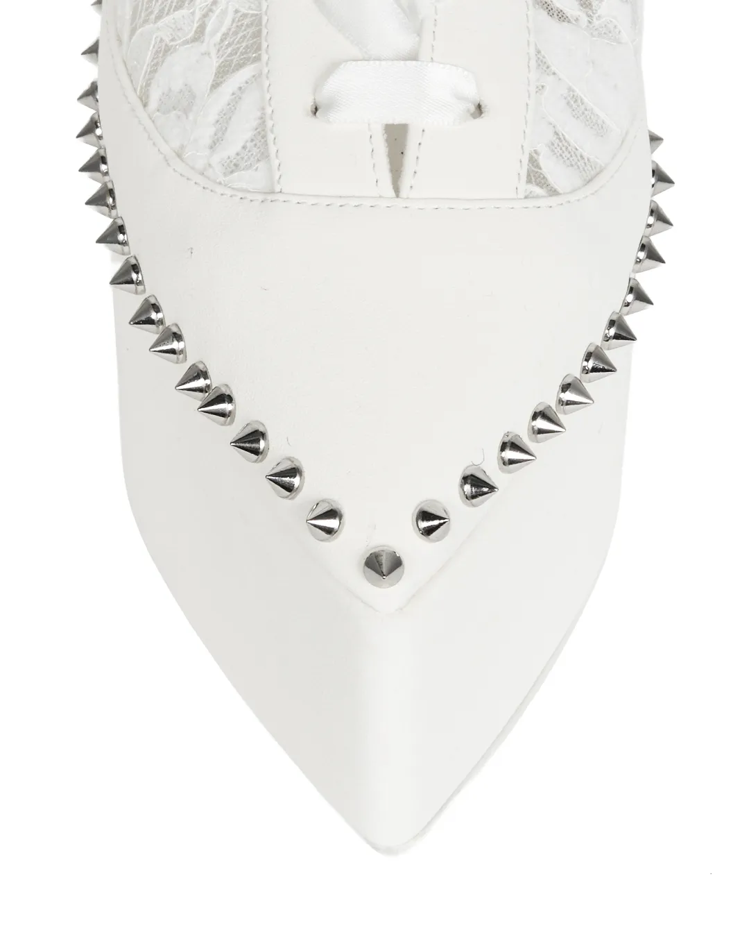 From the opening to the upper, generously placed studs add a sharp edge to the sweetness of the design, powerfully tightening the overall look.