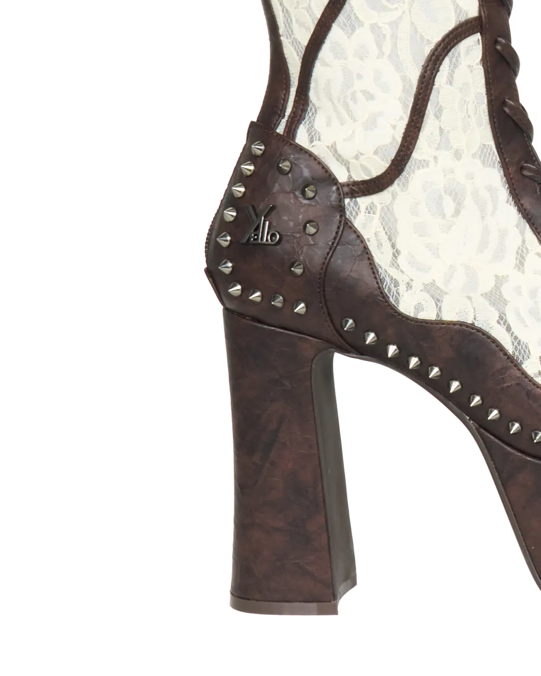 The sheer, delicate lace shaft is finished with curved piping that beautifully contours the calves, enhancing the natural leg line.