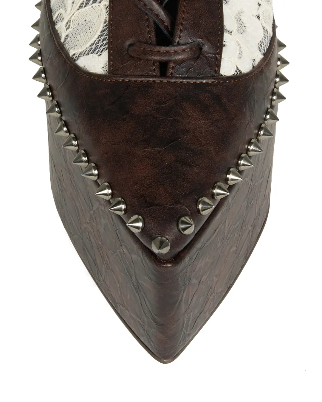 From the opening to the upper, generously placed studs add a sharp edge to the sweetness of the design, powerfully tightening the overall look.