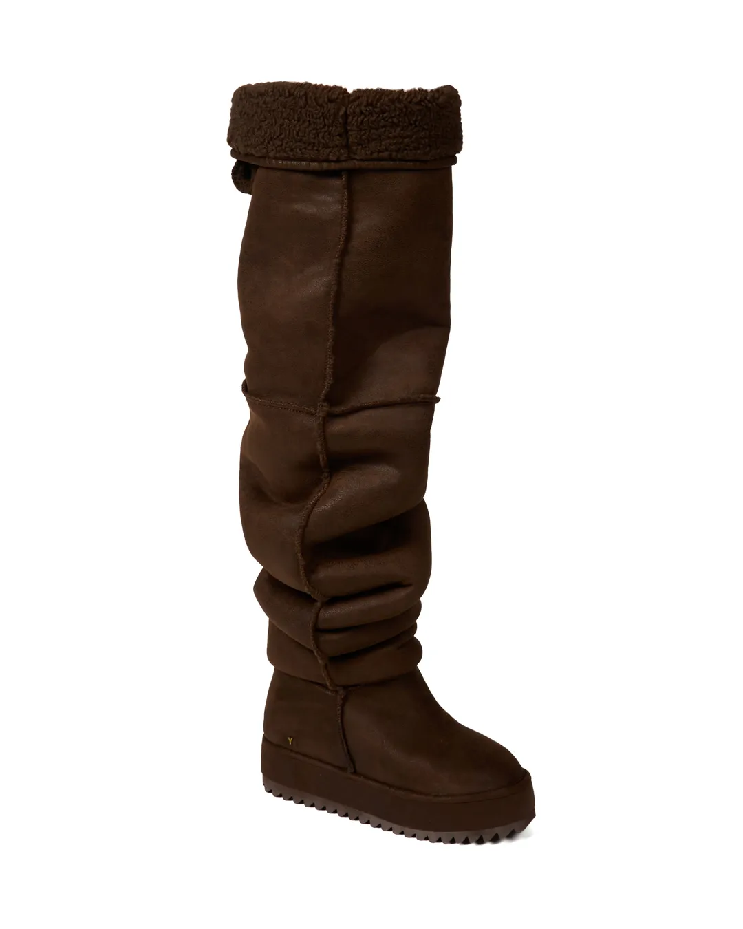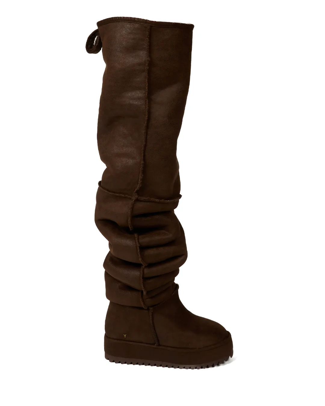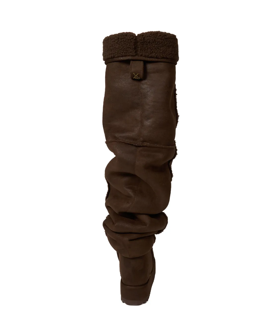 These long boots stand out with a luxurious material that mimics the texture of faux leather so precisely, it’s almost indistinguishable from real sheepskin. A discreet 6.2 cm insole is built in to subtly lift your silhouette and visually elongate the legs. Inside, a soft, skin-friendly boa lining offers excellent warmth and comfort, while the supple construction ensures easy movement without discomfort — even when bending the knees. A signature charm tag at the opening adds a refined finishing touch, and the versatile cuff can be worn folded down, extended, or slouched to suit your style. Finished with a bold shark-sole platform, this pair brings a striking, fashion-forward edge to any winter look.