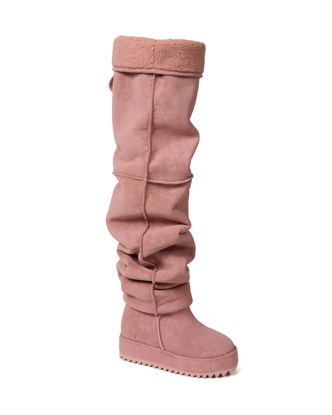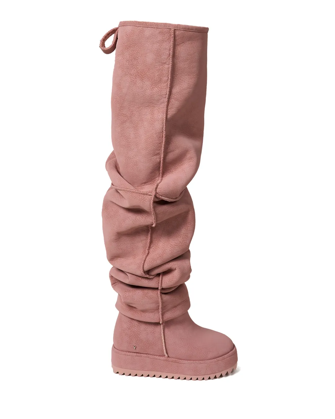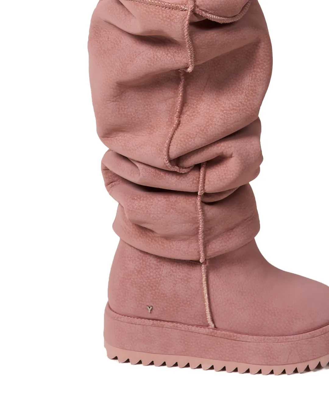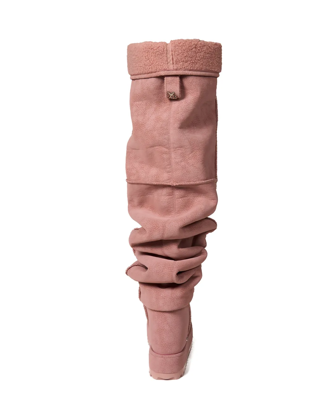 These long boots stand out with a luxurious material that mimics the texture of faux leather so precisely, it’s almost indistinguishable from real sheepskin. A discreet 6.2 cm insole is built in to subtly lift your silhouette and visually elongate the legs. Inside, a soft, skin-friendly boa lining offers excellent warmth and comfort, while the supple construction ensures easy movement without discomfort — even when bending the knees. A signature charm tag at the opening adds a refined finishing touch, and the versatile cuff can be worn folded down, extended, or slouched to suit your style. Finished with a bold shark-sole platform, this pair brings a striking, fashion-forward edge to any winter look.