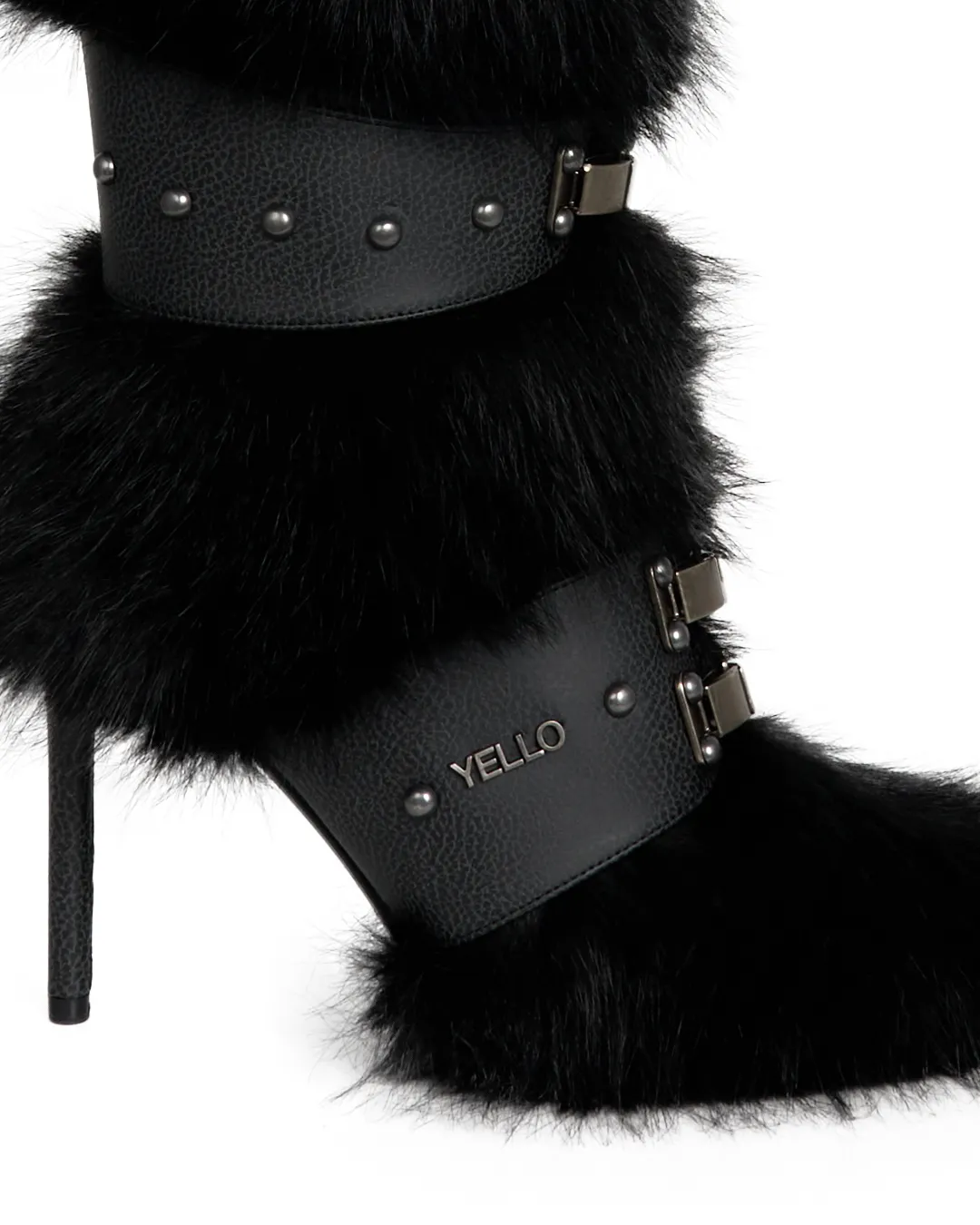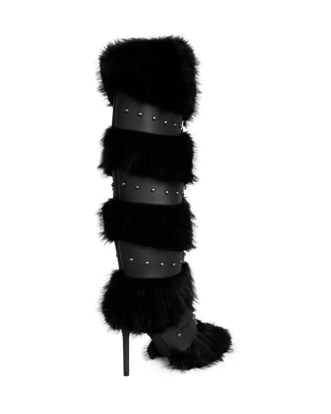 Luxurious yet bold, these long boots are wrapped in plush, high-quality faux fur that makes a dramatic statement. The voluminous fur offers exceptional warmth, while a studded belt layered over the top cinches the leg visually, creating a beautifully elongated silhouette. The over-the-knee length refines the shape and adds elegant depth to any outfit. A slender, sharply sculpted 8cm stiletto heels introduces a sophisticated edge, and a signature logo charm provides a final, fashion-forward accent. Elegant yet commanding, this striking pair instantly elevates your winter wardrobe with a sense of modern glamour.