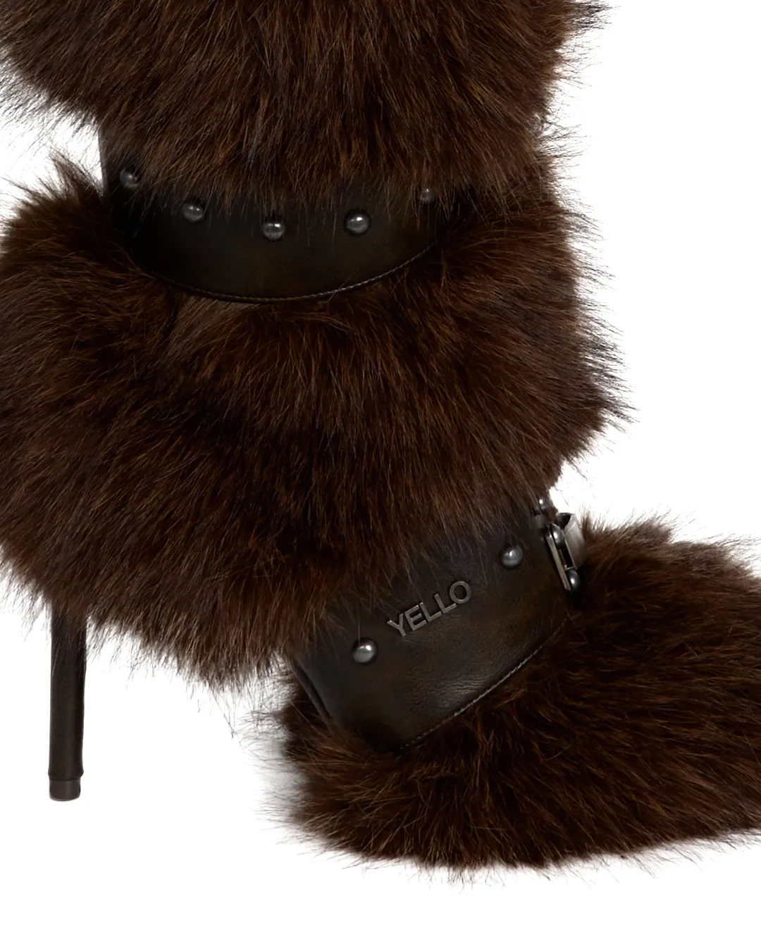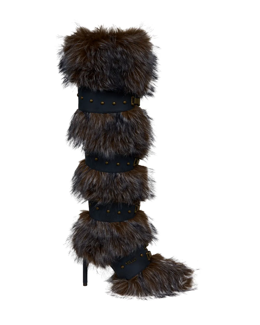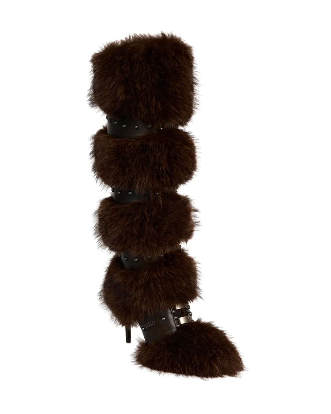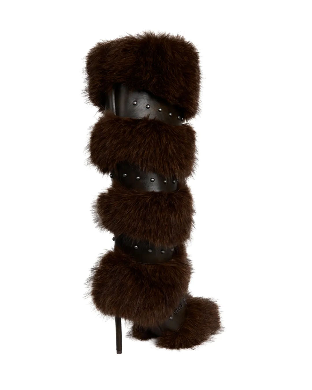 Luxurious yet bold, these long boots are wrapped in plush, high-quality faux fur that makes a dramatic statement. The voluminous fur offers exceptional warmth, while a studded belt layered over the top cinches the leg visually, creating a beautifully elongated silhouette. The over-the-knee length refines the shape and adds elegant depth to any outfit. A slender, sharply sculpted 8cm stiletto heels introduces a sophisticated edge, and a signature logo charm provides a final, fashion-forward accent. Elegant yet commanding, this striking pair instantly elevates your winter wardrobe with a sense of modern glamour.