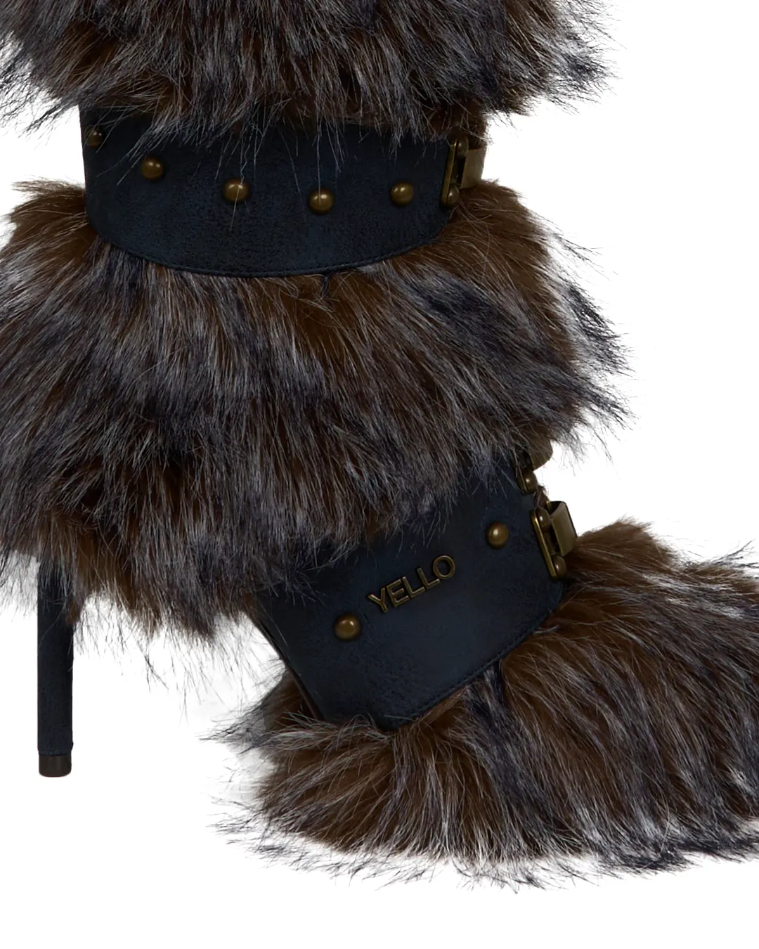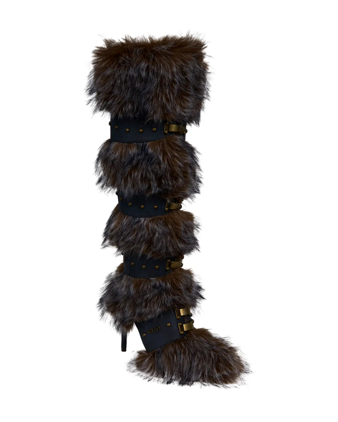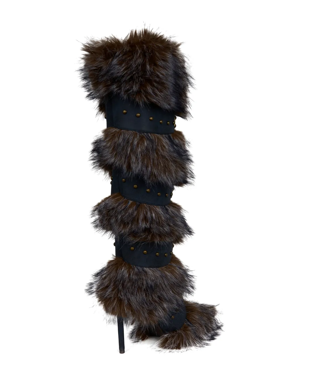 Luxurious yet bold, these long boots are wrapped in plush, high-quality faux fur that makes a dramatic statement. The voluminous fur offers exceptional warmth, while a studded belt layered over the top cinches the leg visually, creating a beautifully elongated silhouette. The over-the-knee length refines the shape and adds elegant depth to any outfit. A slender, sharply sculpted 8cm stiletto heels introduces a sophisticated edge, and a signature logo charm provides a final, fashion-forward accent. Elegant yet commanding, this striking pair instantly elevates your winter wardrobe with a sense of modern glamour.