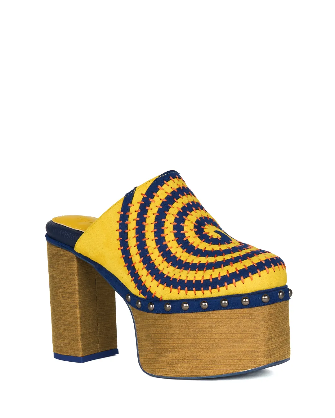 A chunky-heel mule with a swirling, sculptural design that naturally draws the eye.
