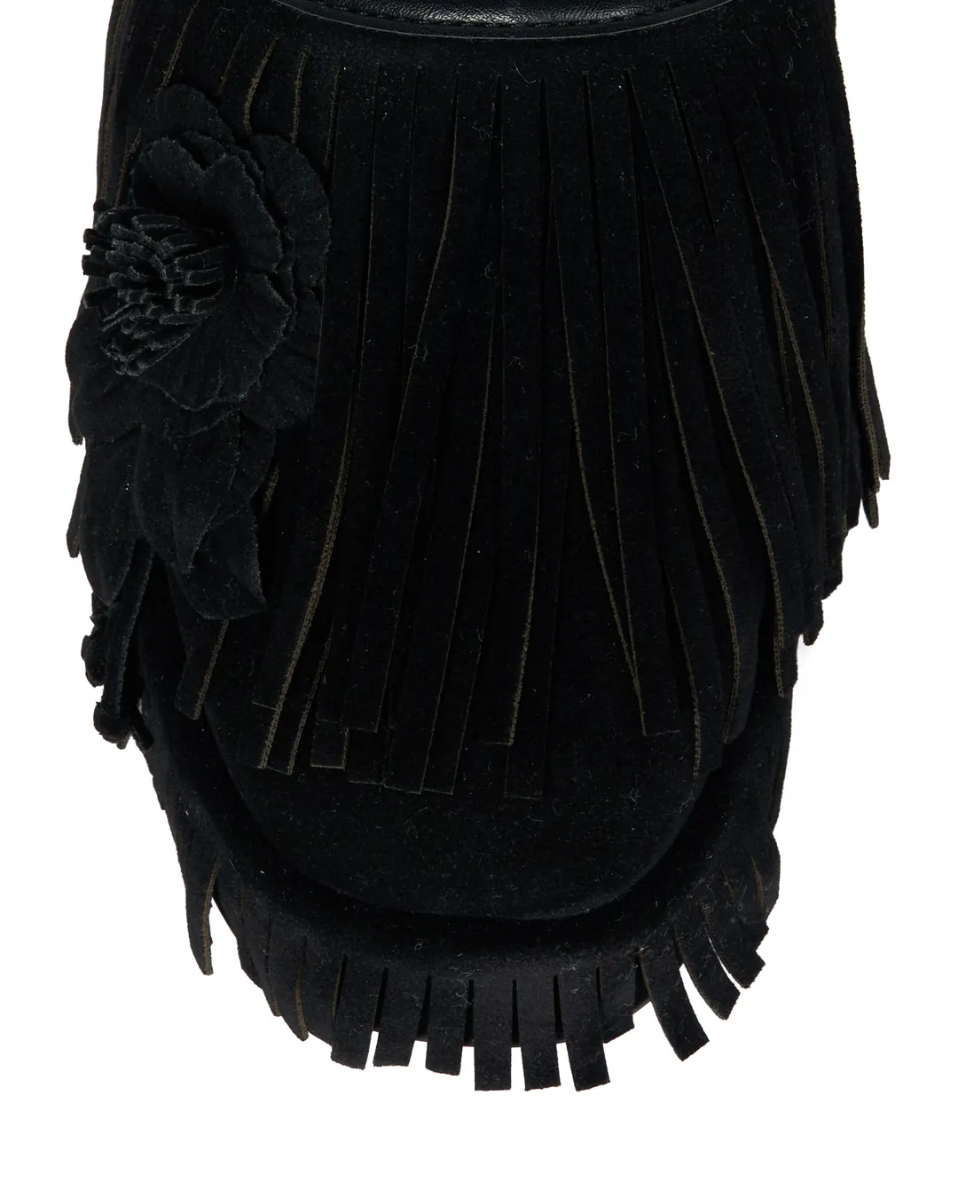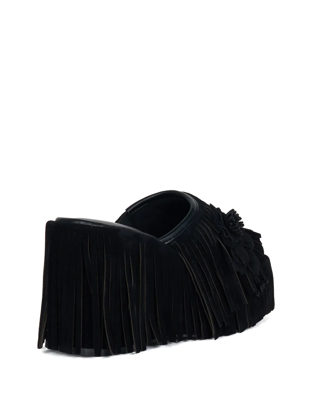 A platform mule with flowing fringe that sways with every step, instantly drawing the eye.