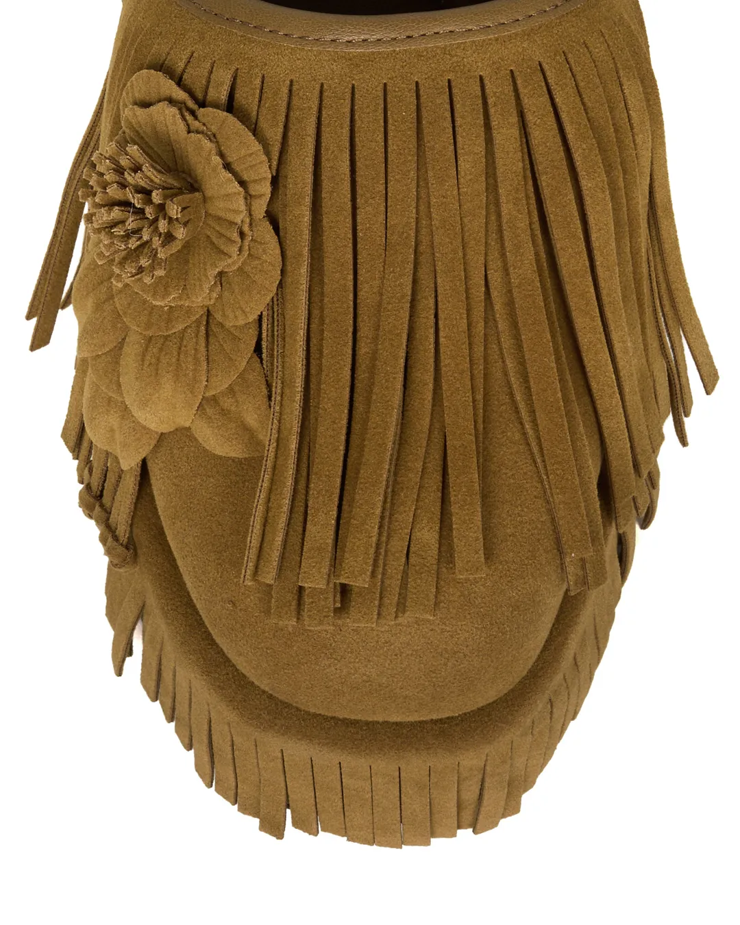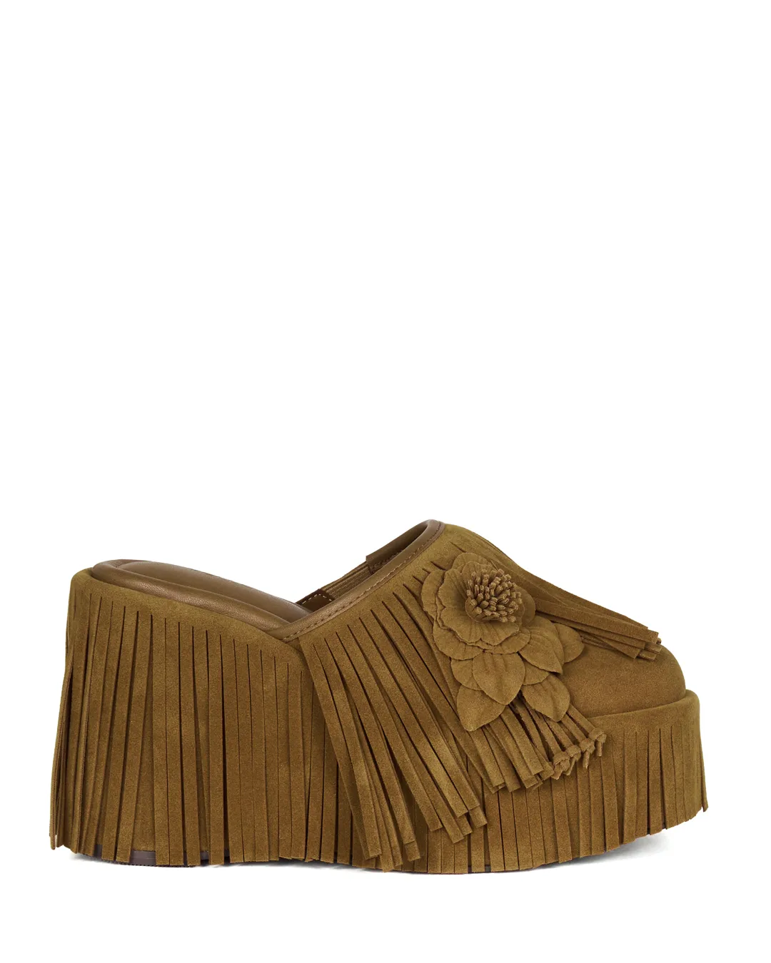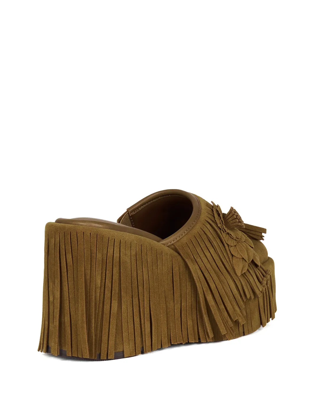 A platform mule with flowing fringe that sways with every step, instantly drawing the eye.