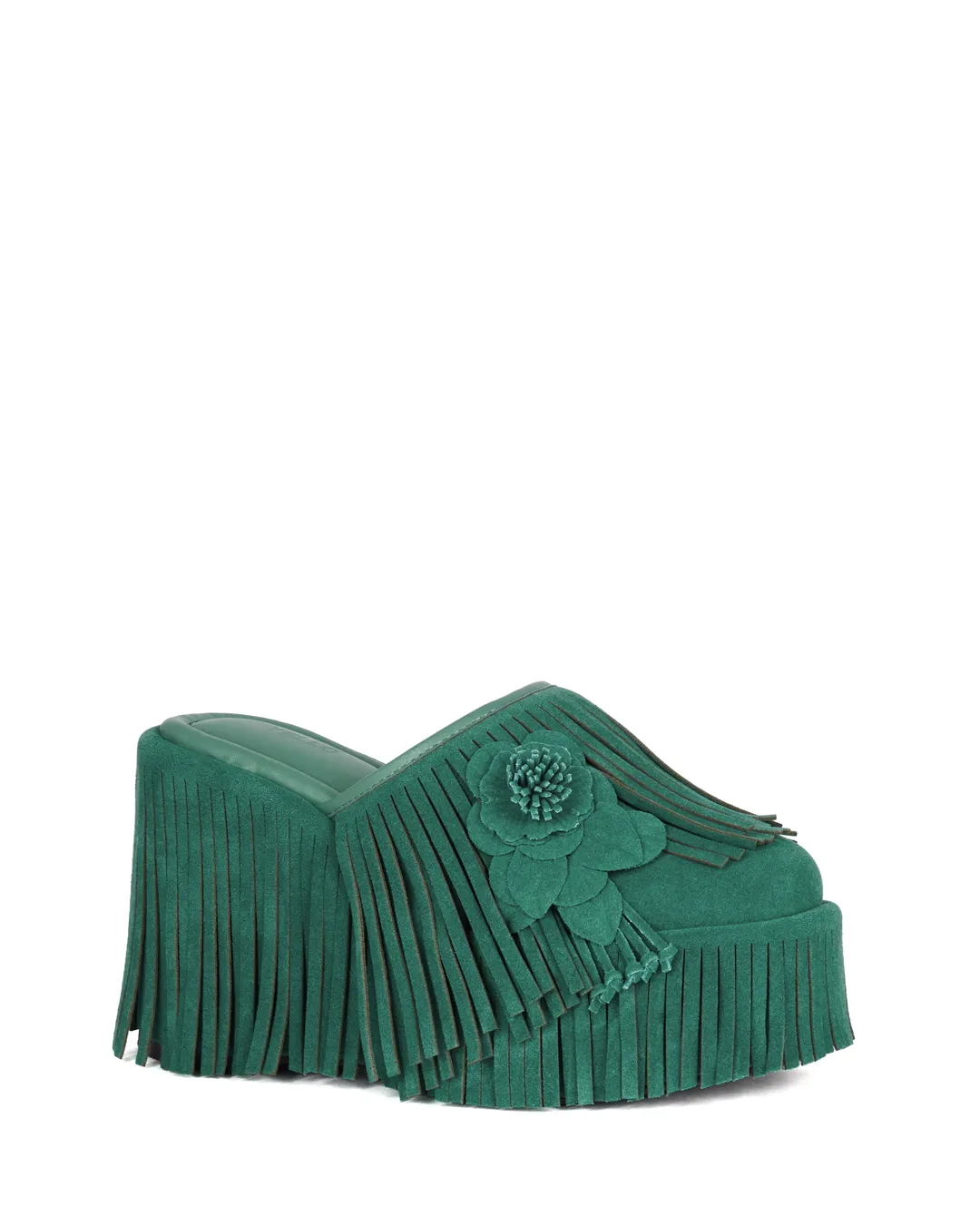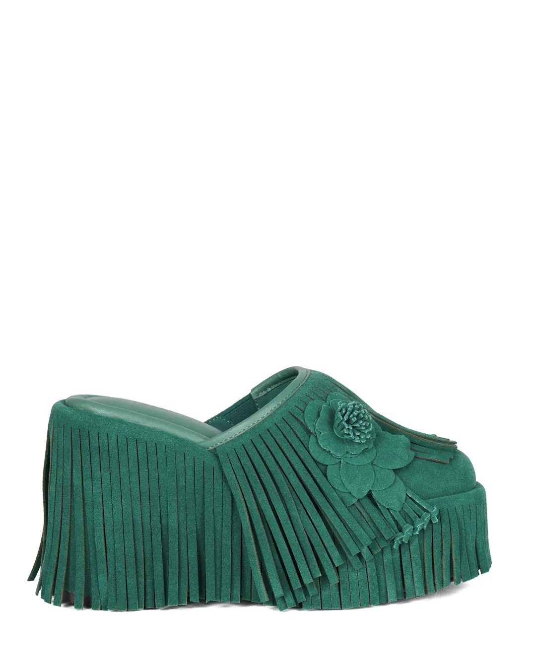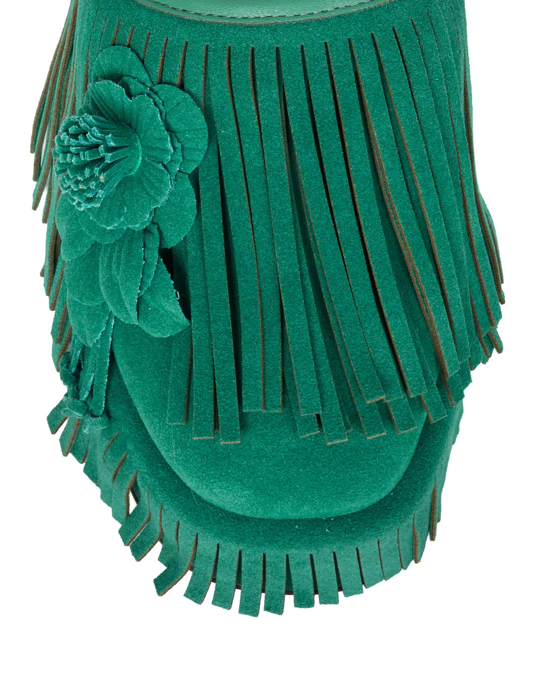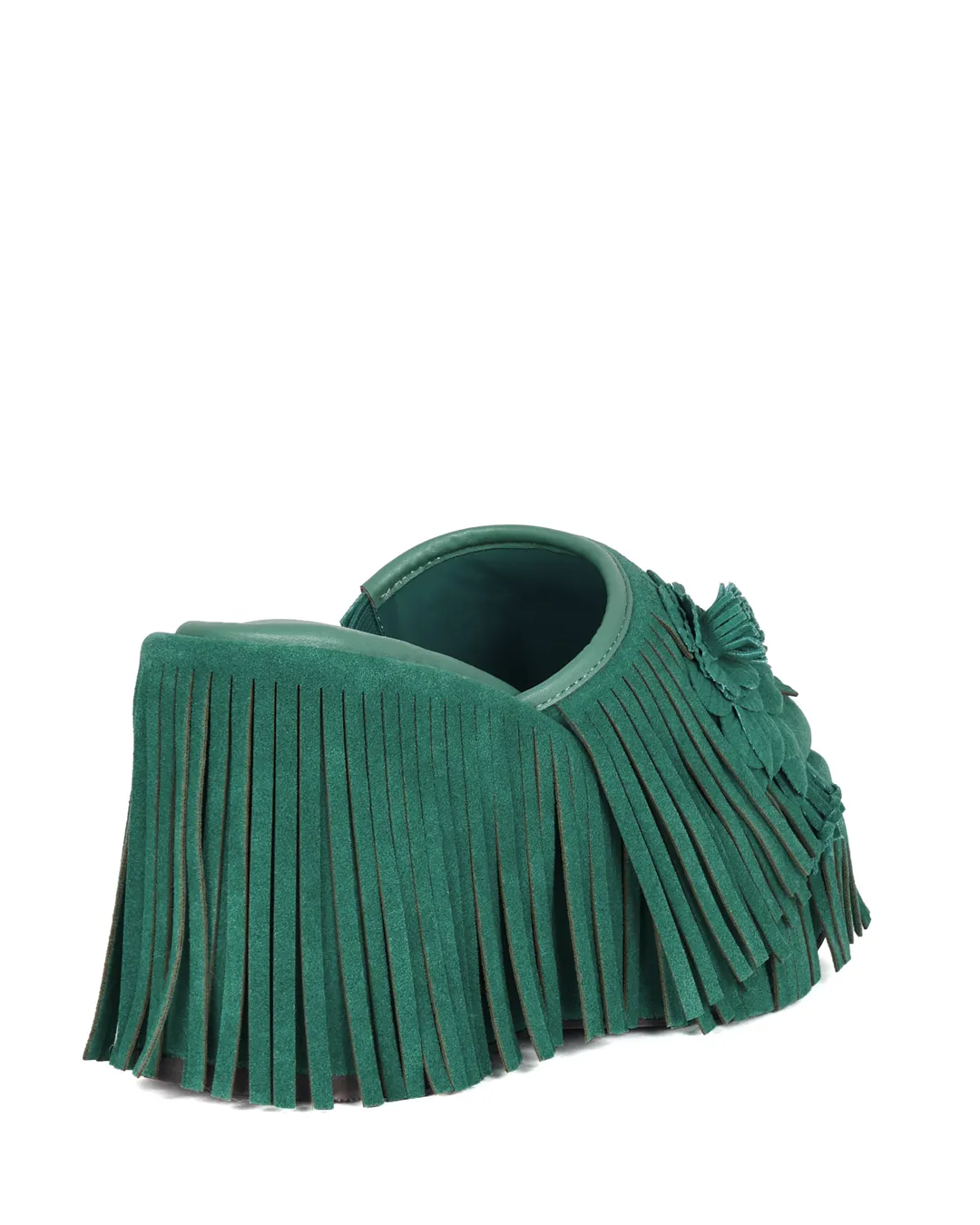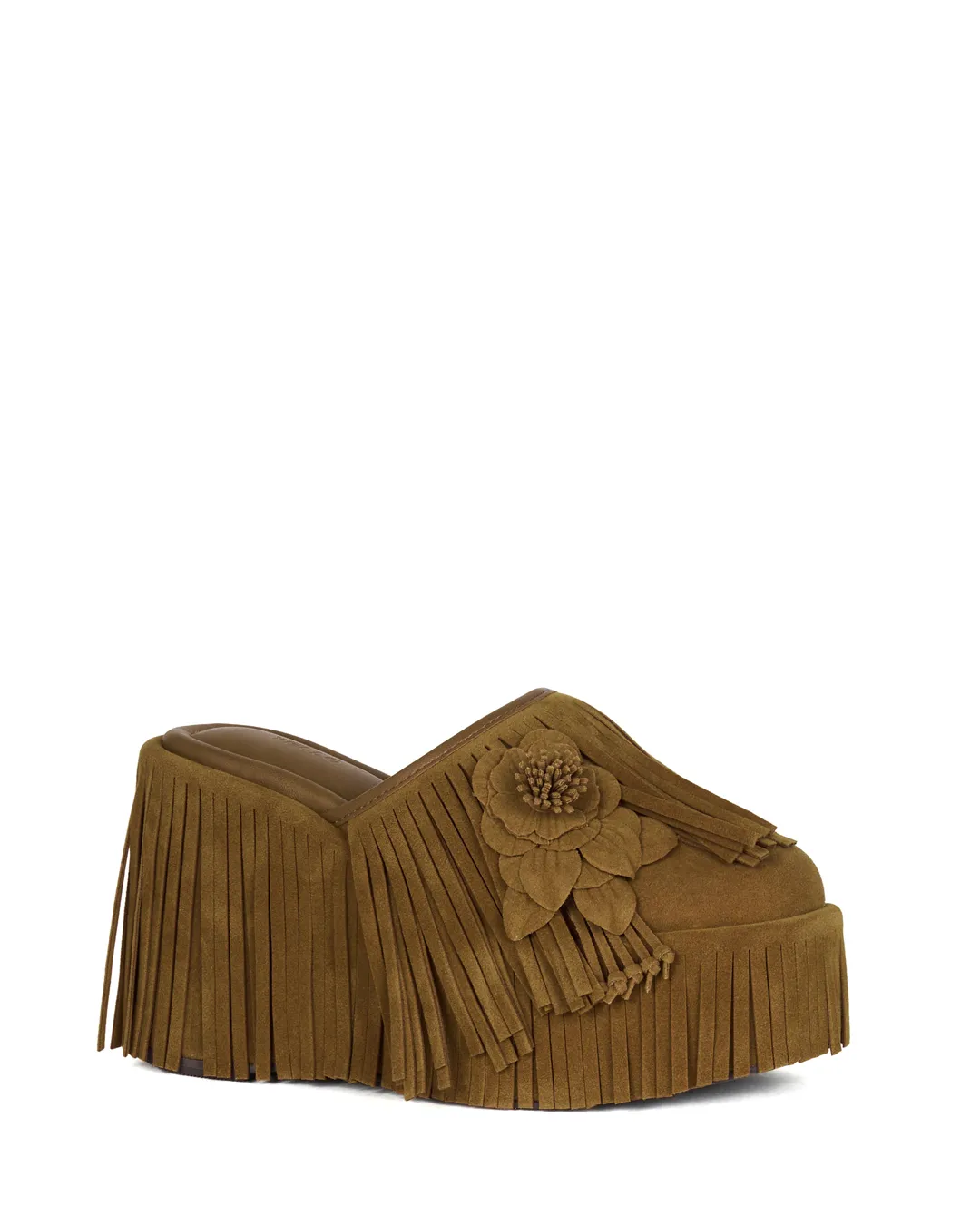 A platform mule with flowing fringe that sways with every step, instantly drawing the eye.