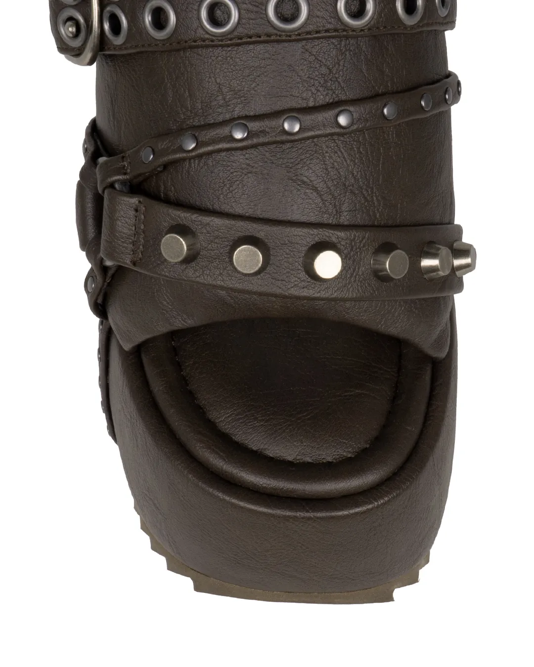Eyelet details and studs on the belt further enhance its edgy character, where ruggedness meets refinement.