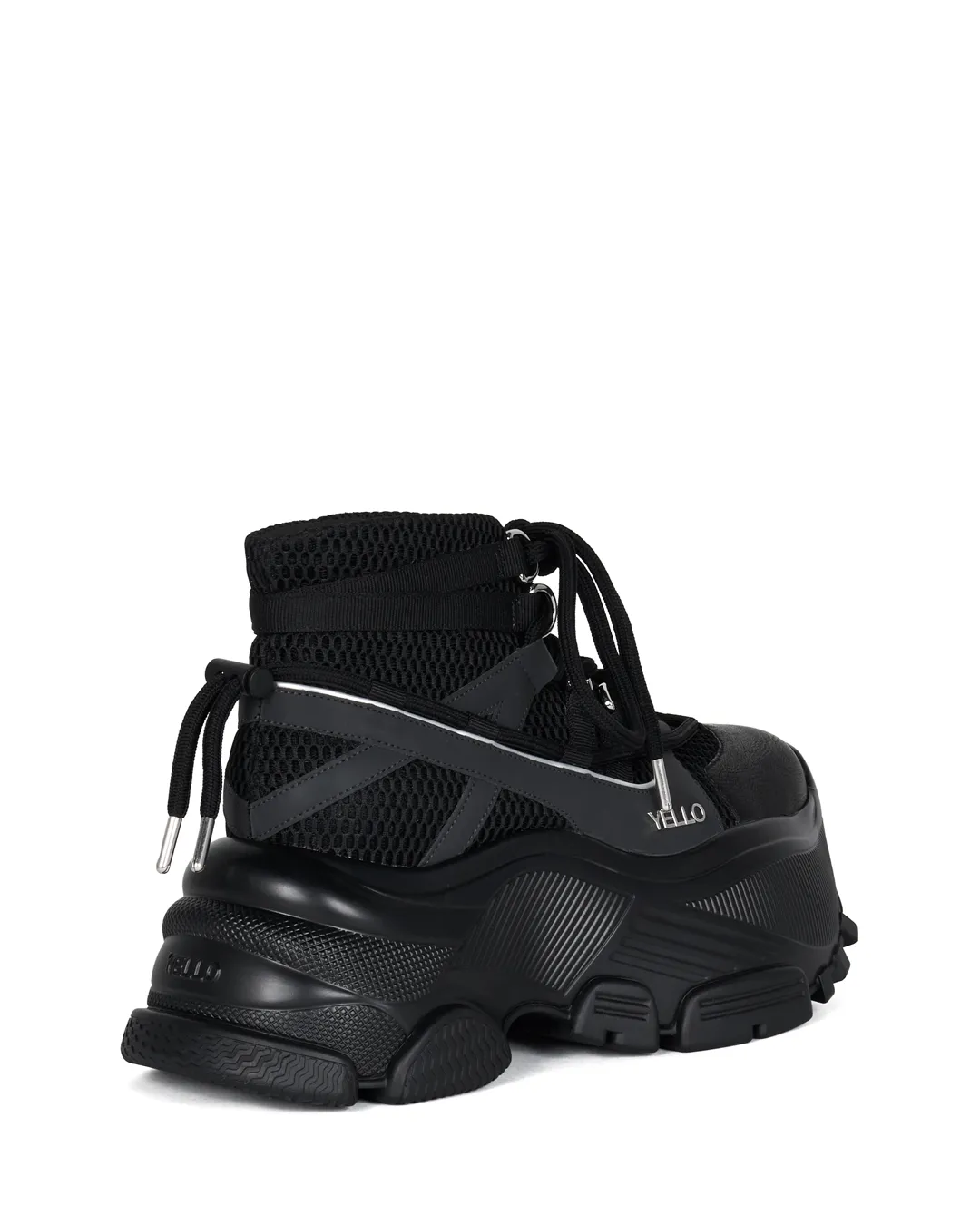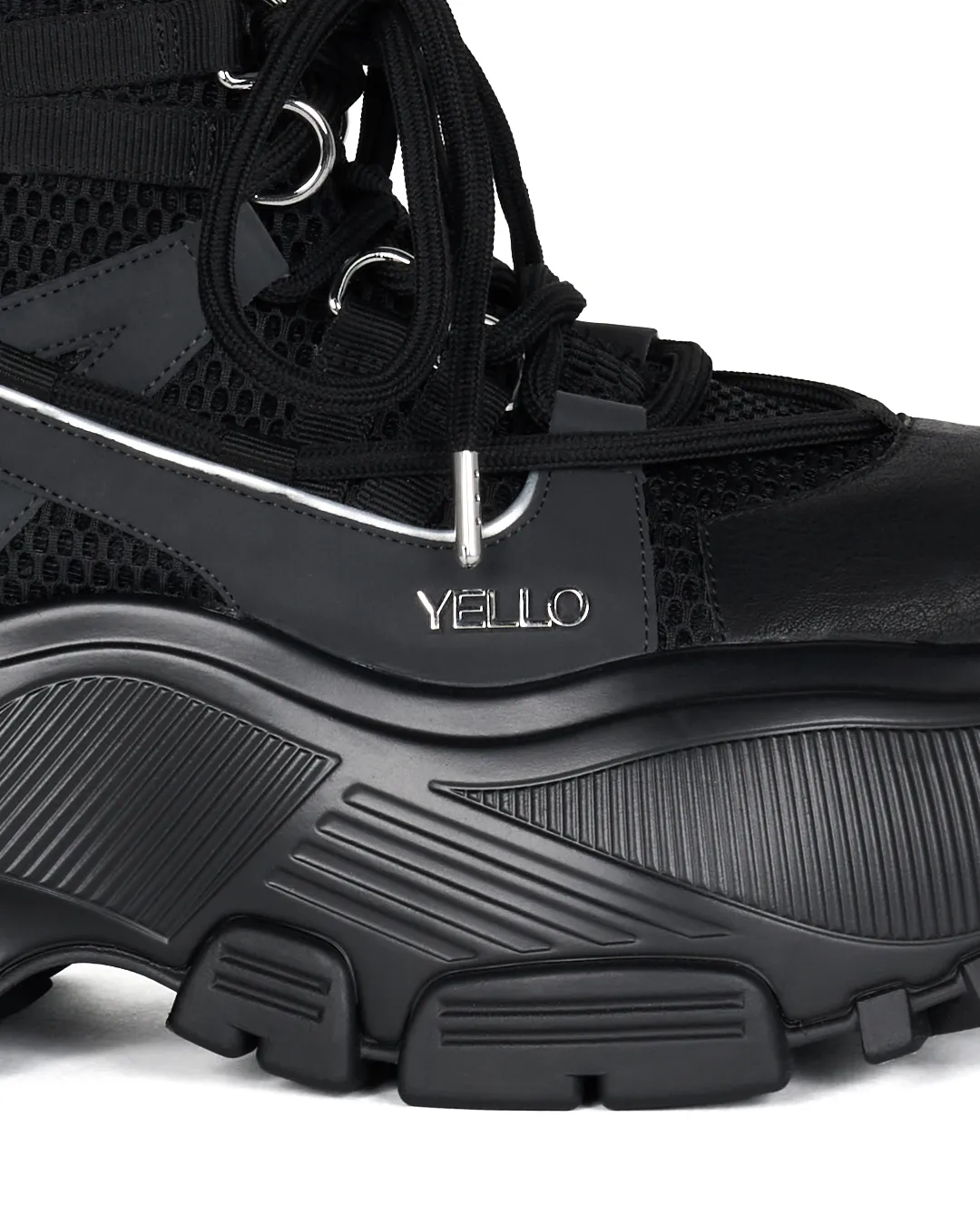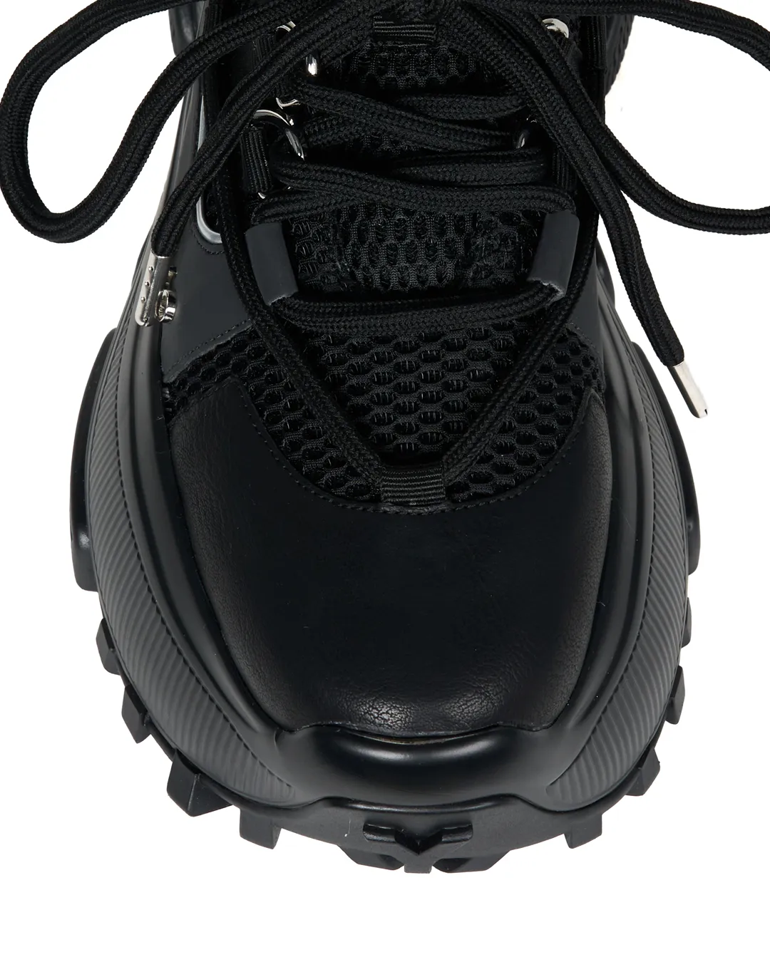 Sporty short boots featuring intricate detailing and a precise fusion of mixed materials.