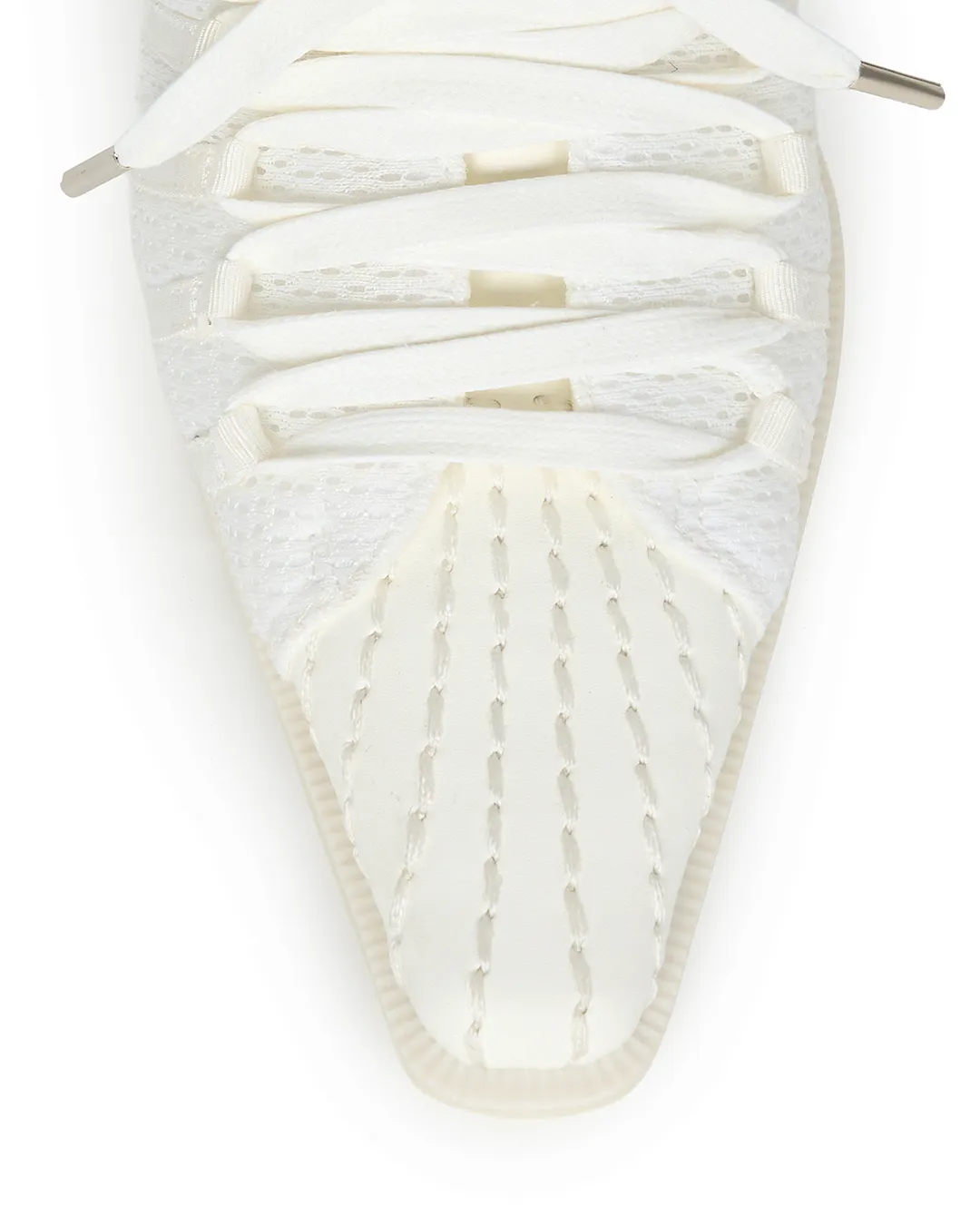 Point stitching at the toe, an elongated pointed toe shape, and delicate lace-up detailing work together to visually elongate the legs.