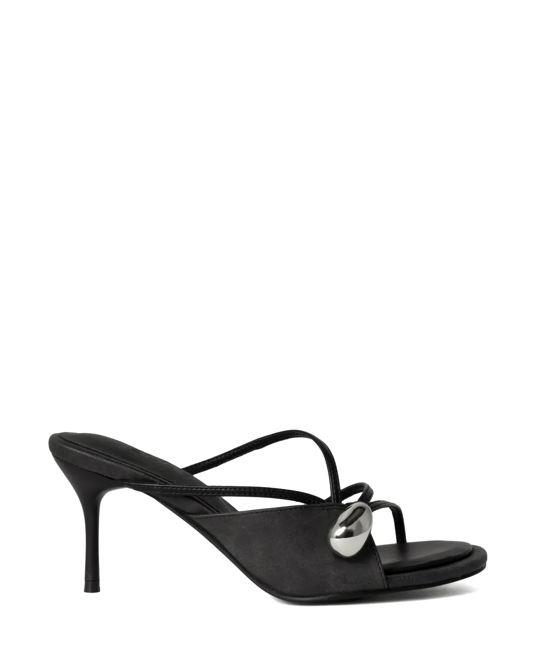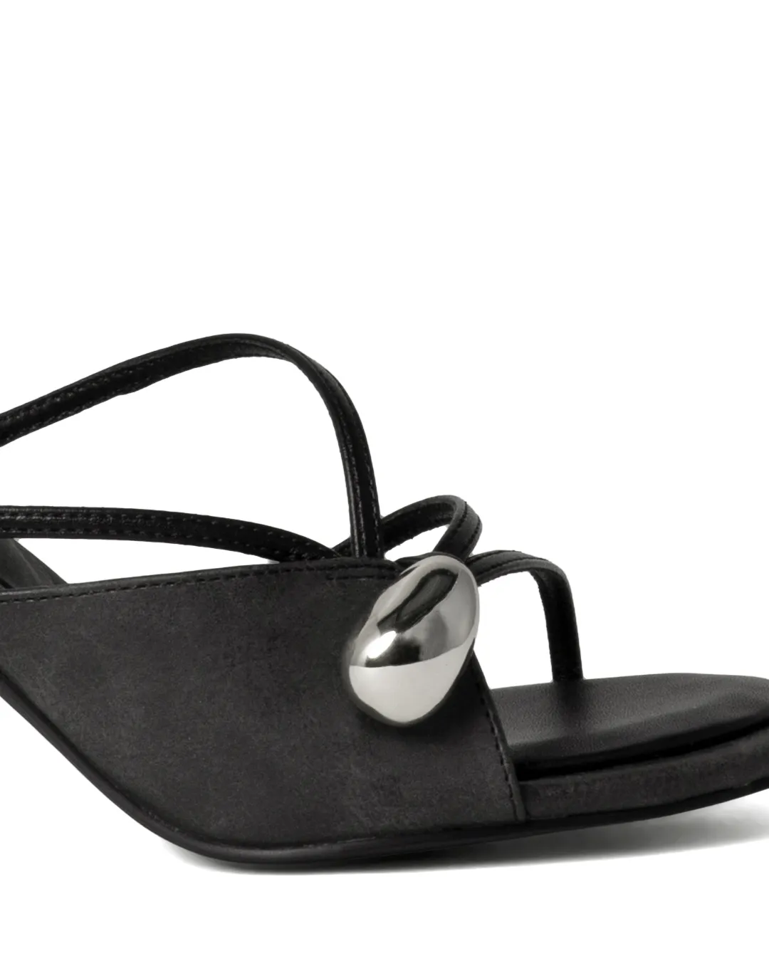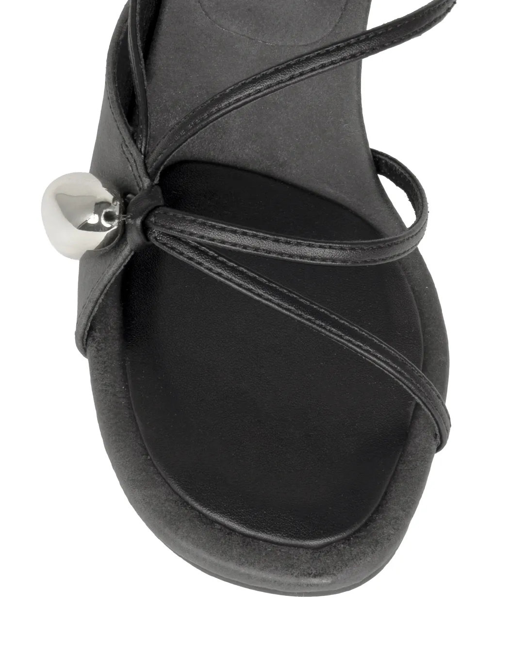 Three slender upper straps create a clean, delicate look on bare feet, while the 7.4cm heel visually lengthens the legs below the knee for a graceful silhouette.