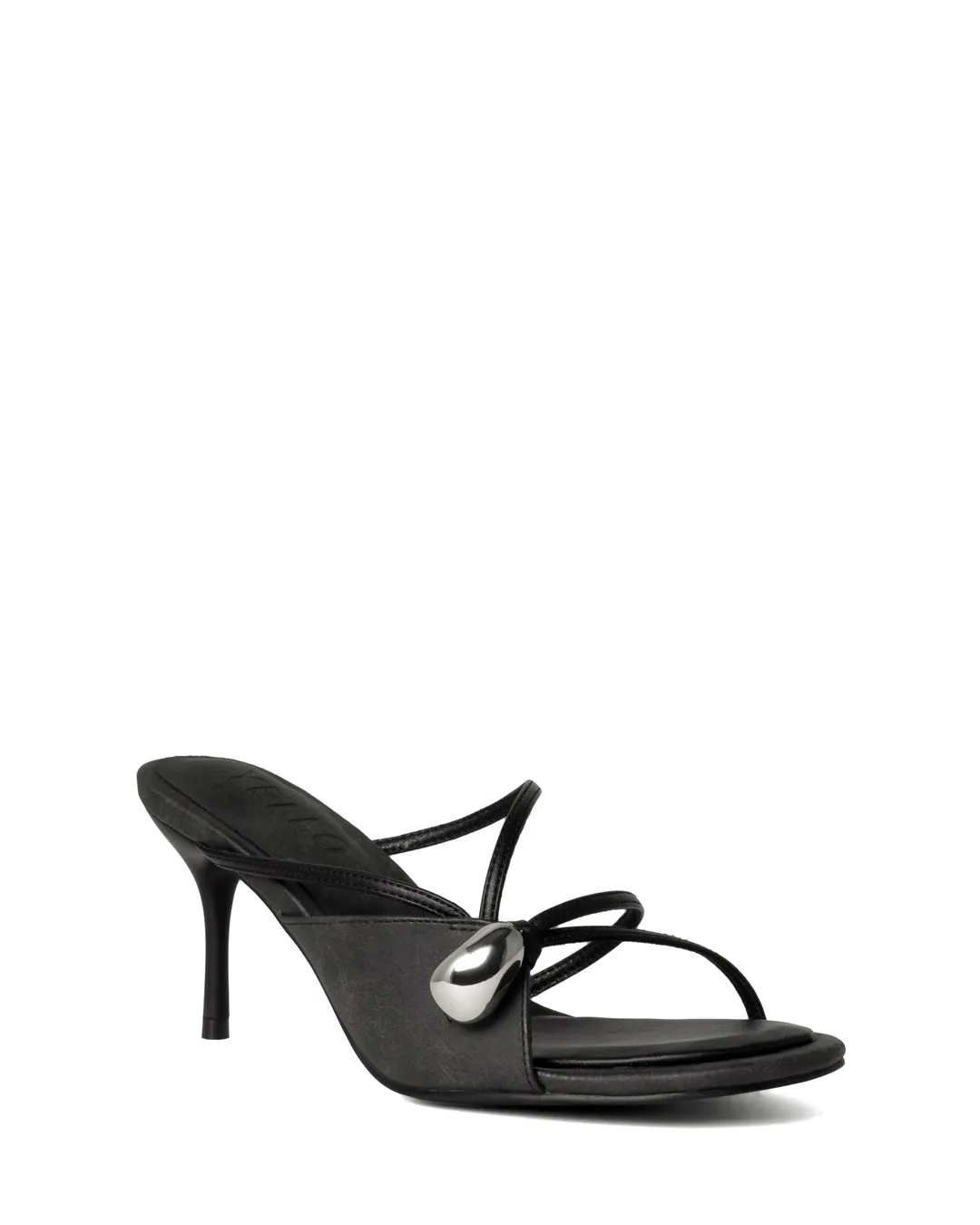 Three slender upper straps create a clean, delicate look on bare feet, while the 7.4cm heel visually lengthens the legs below the knee for a graceful silhouette.