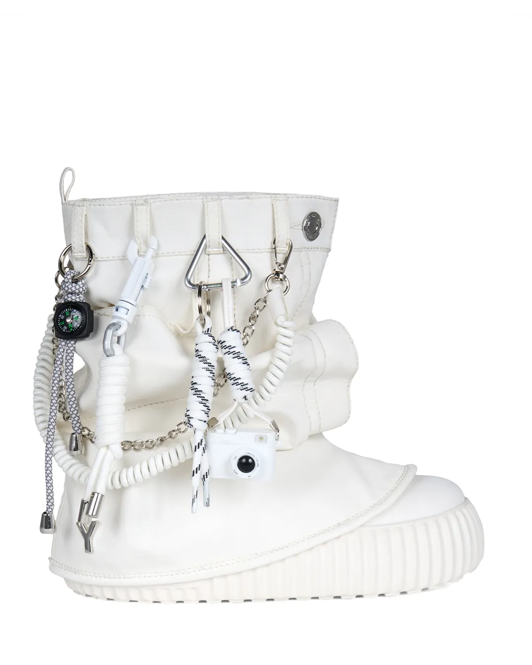Short boots with a conceptual upper design inspired by pant details that instantly capture attention.
