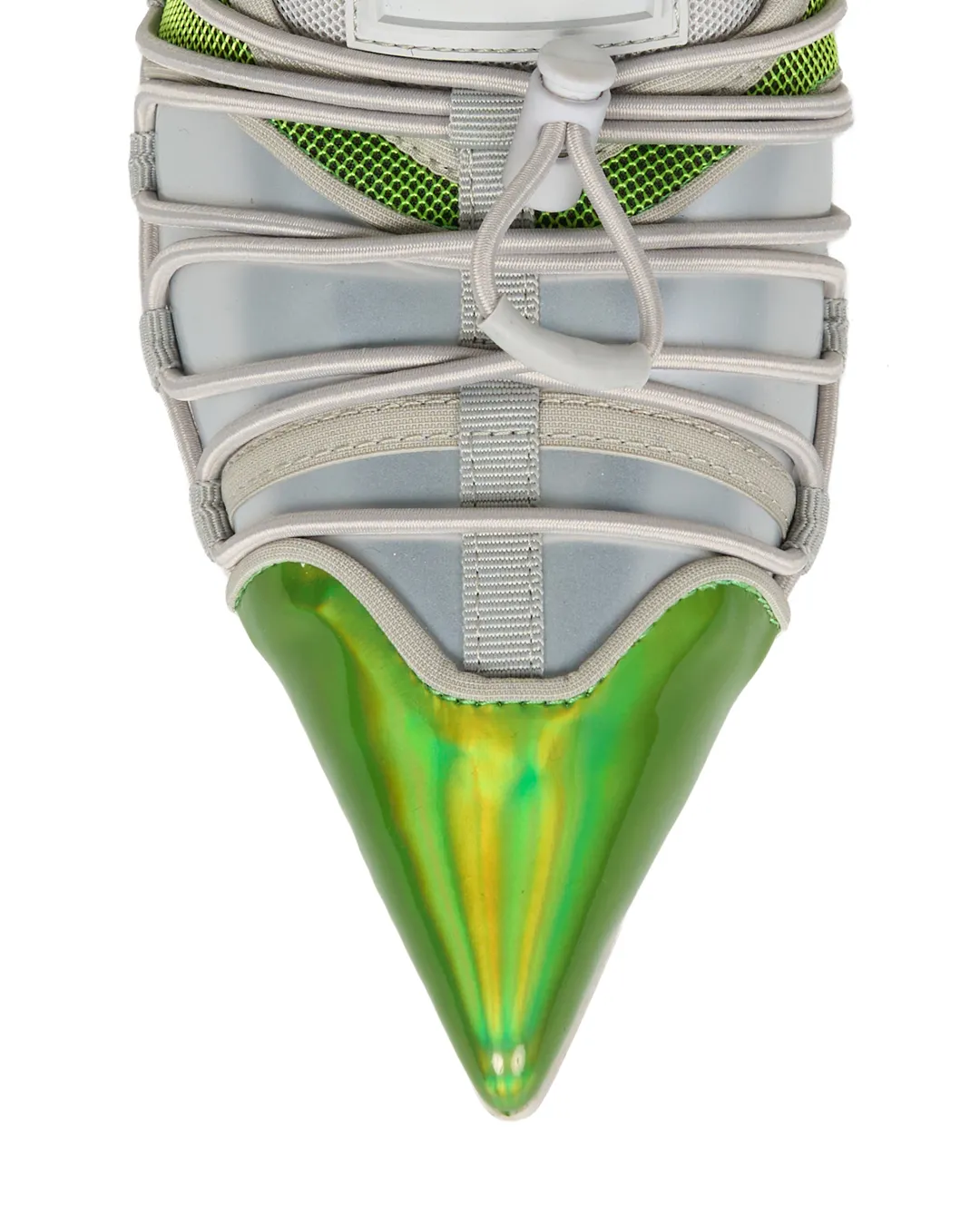 Elastic cords across the instep allow for adjustable fit with a cord stopper, while the same cords wrap around the shoe as a decorative detail, adding an edgy accent to the overall design.