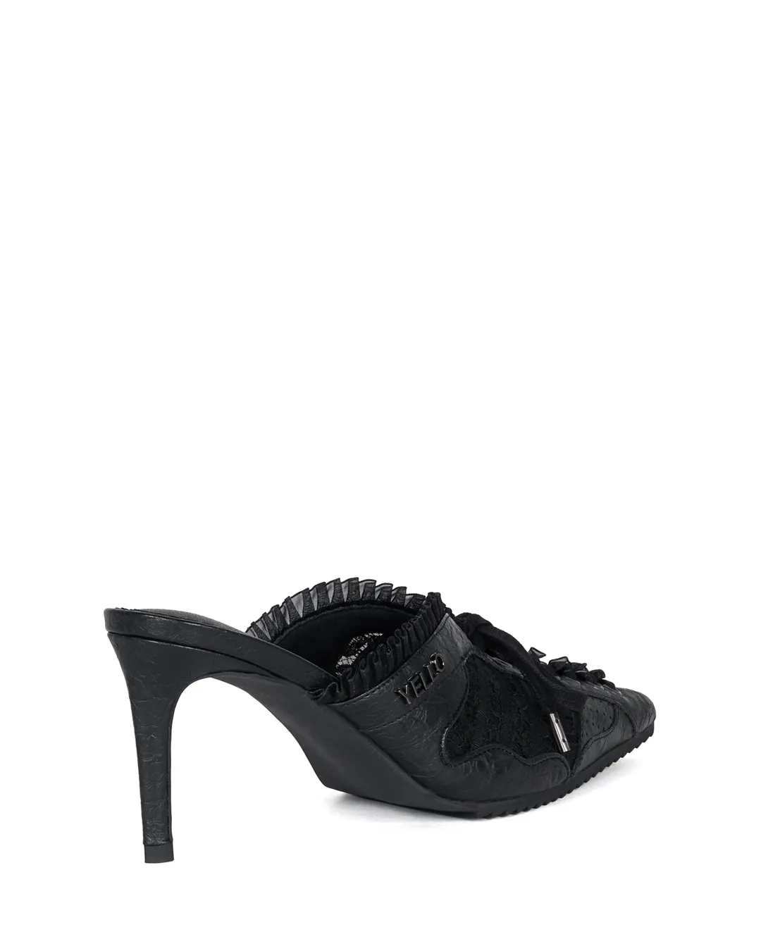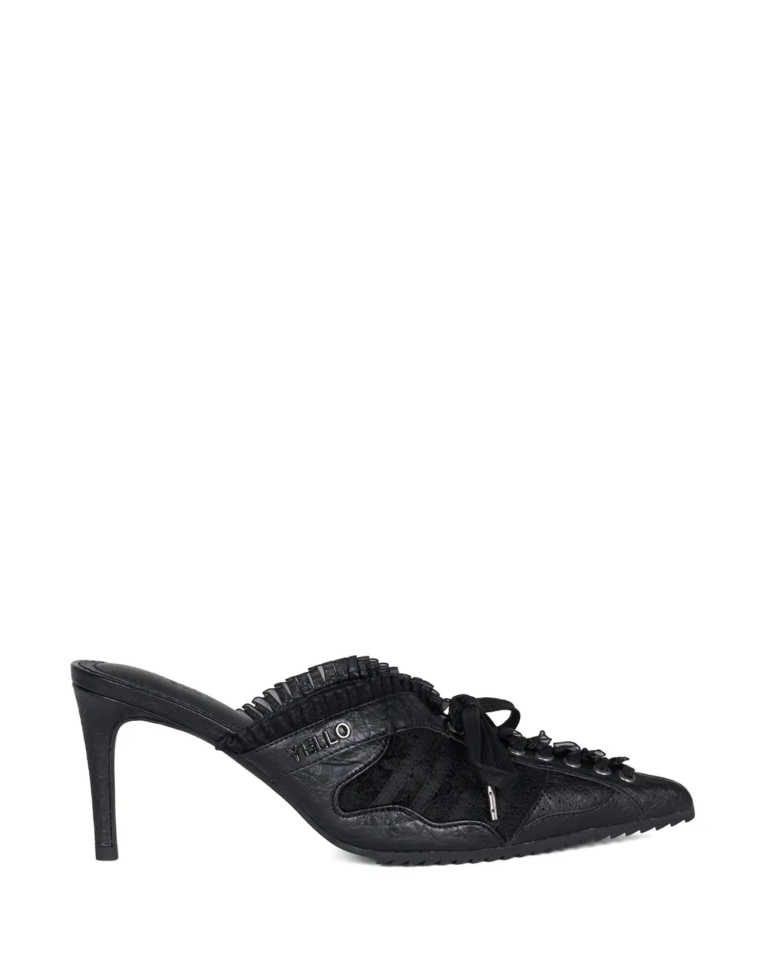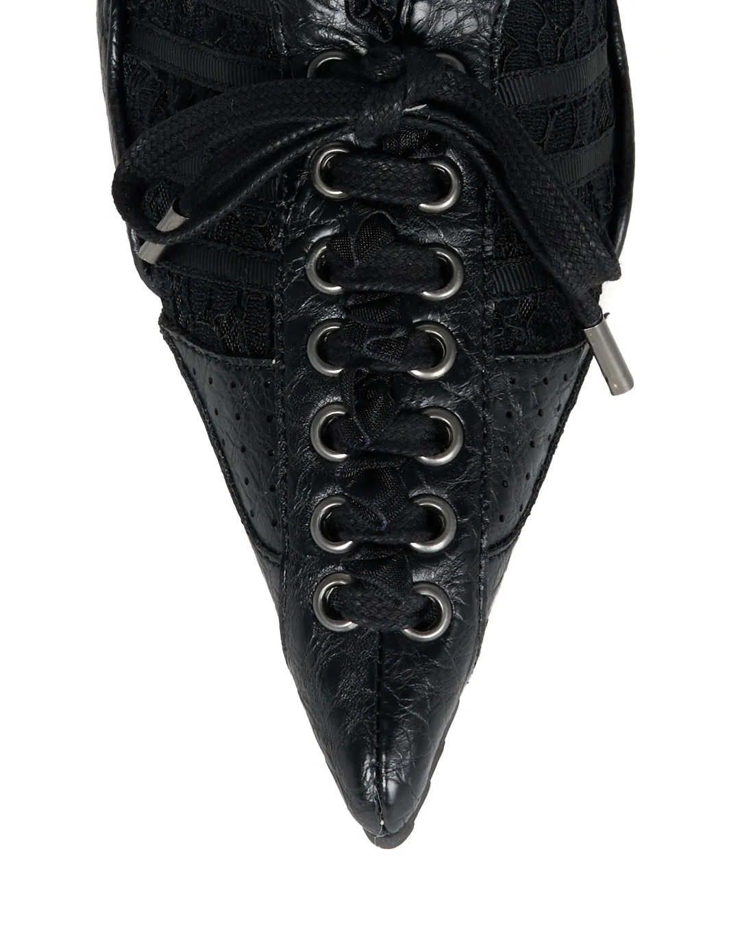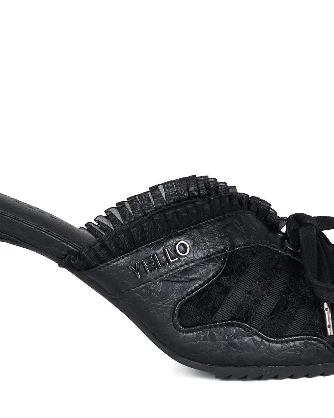 Lace-up detailing on the upper adds dimension and depth, while the delicate lace and soft frills contrast beautifully with the body’s sharp lines, creating a look that changes with every angle.