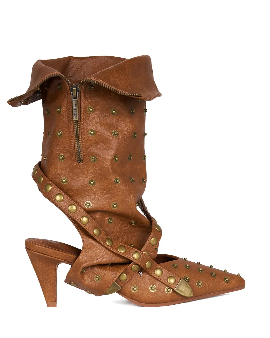 Metal snaps across the upper allow the included belt to be attached as desired—an iconic YELLO design detail that lets you change the look to match your styling or mood.
