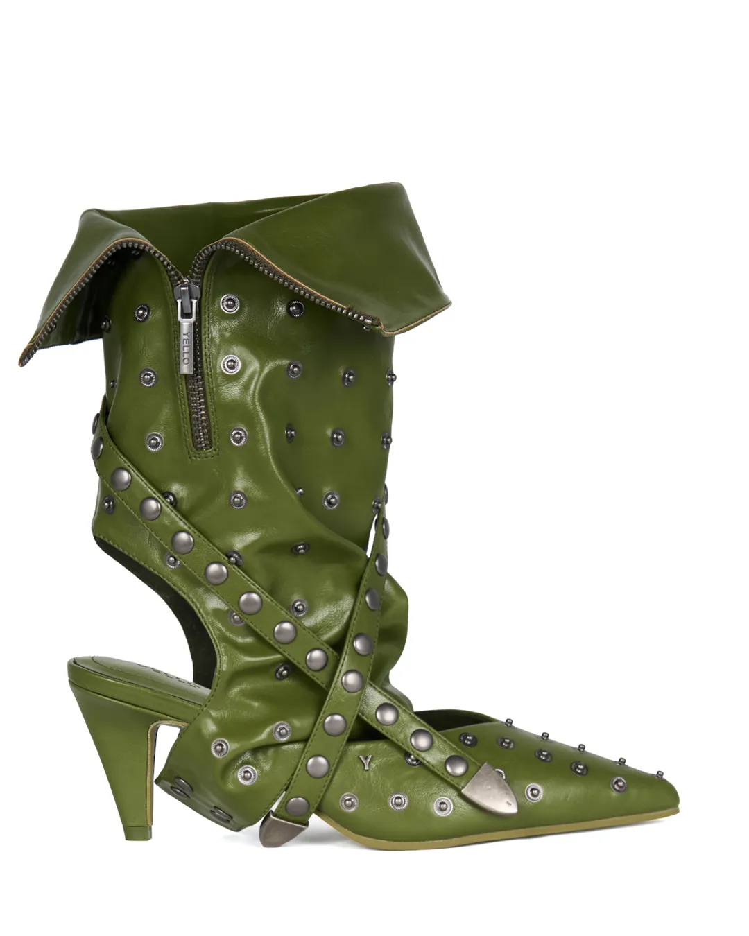 Metal snaps across the upper allow the included belt to be attached as desired—an iconic YELLO design detail that lets you change the look to match your styling or mood.