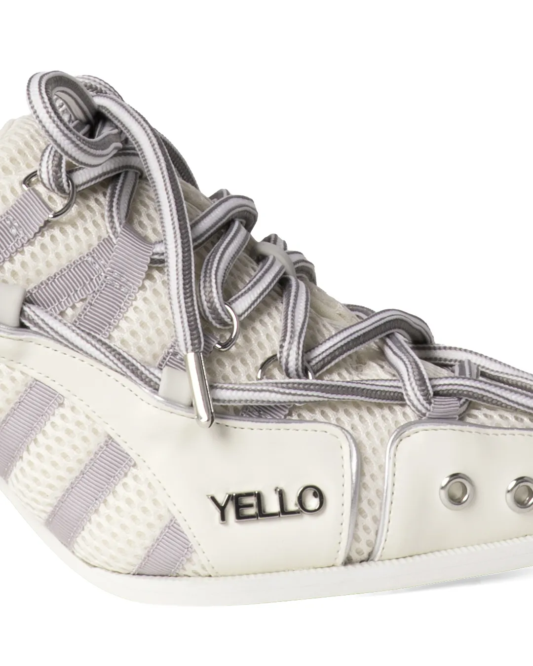Precisely engineered lines, trims, and lace detailing are paired with metal eyelets at the toe, introducing an industrial, engineered aesthetic.