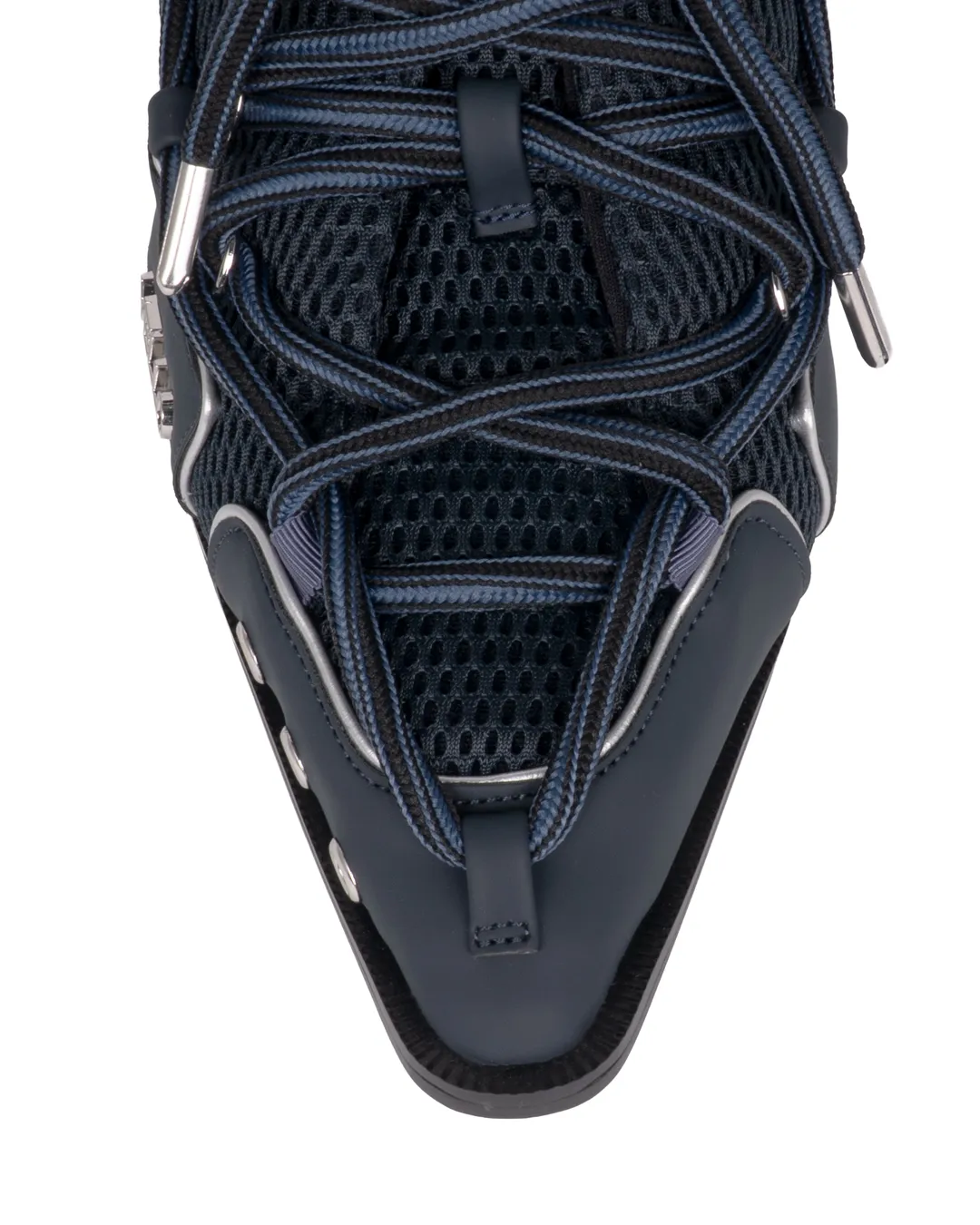 Precisely engineered lines, trims, and lace detailing are paired with metal eyelets at the toe, introducing an industrial, engineered aesthetic.